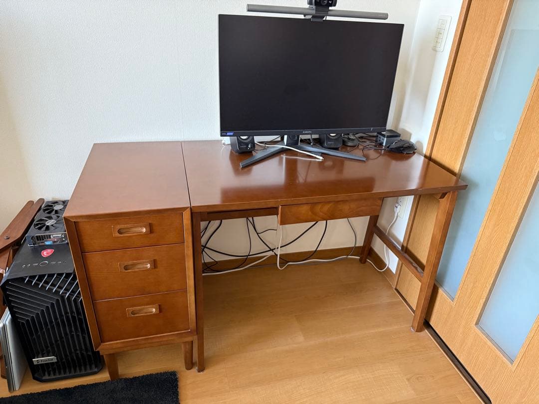ご覧いただきありがとうございます。MUJIの木製デスク、2つの引き出し付き。4年ほど使っております。状態の確認は写真でお願いいたします。足の部分は解体して発送させていただきます。- 色: オーク- 引き出し数: 2- デザイン: シンプルなデザイン- 素材: 木製- サイズ: 幅110×奥行55×高さ70cm値段の相談は可能です。